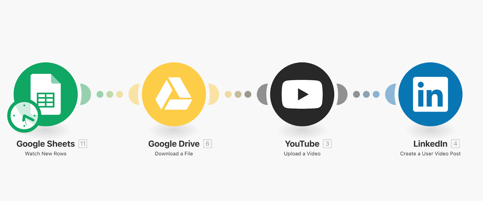 Programmez l’envoi de vidéos depuis votre Google Sheets vers Youtube, puis vers Linkedin. Cette automatisation sera très pratique pour les créateurs de contenus qui souhaitent planifier leur stratégie marketing sans avoir besoin de passer plusieurs minutes par jour à publier leurs vidéos sur tous leurs réseaux sociaux. Cette automatisation vous permettra d’avoir une présence accrue sur vos canaux de diffusion et de maintenir une cohérence qui ne manquera pas de convaincre vos prospects de votre professionnalisme.